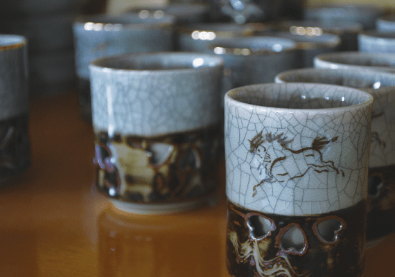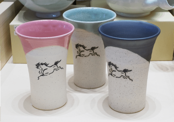 味わいのある「青ひび」、内側と外側で2つの器を重ねる「二重焼(ふたえやき)」、一気に描き上げられる「走り駒」。長い歴史を持つ「大堀相馬焼」ですが、最近では彩りのある作品も増えています。